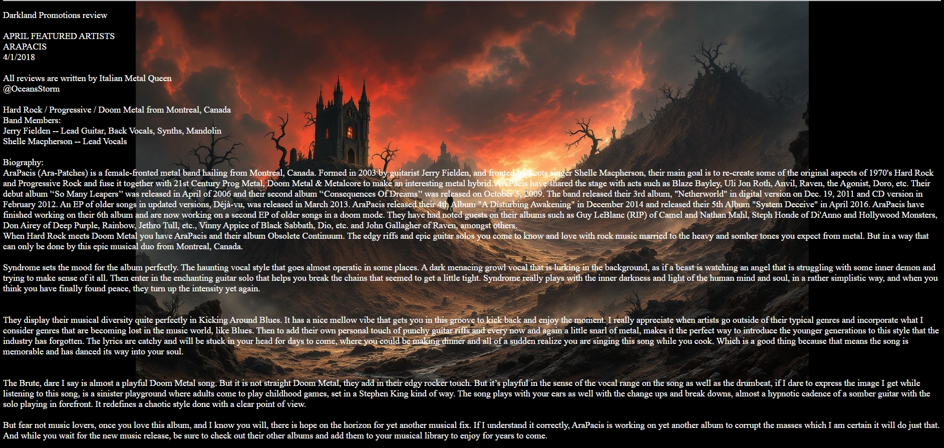 @OceansStorm highlights the album's atmospheric tone and genre-blending creativity, noting AraPacis's ability to fuse doom, prog, and classic metal into a cohesive experience.